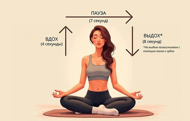 Как: Вдох через нос на 4 счёта → Задержка дыхания на 7 секунд → Медленный выдох через рот на 8 счетов.