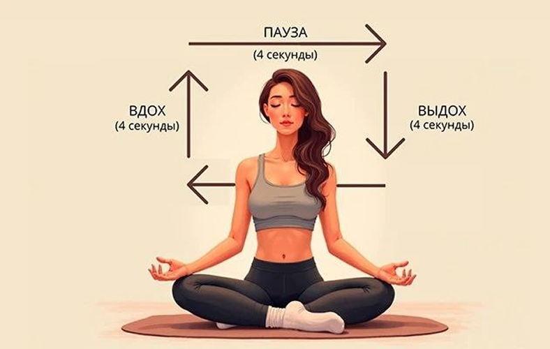Как: Вдох на 4 счёта → Задержка на 4 → Выдох на 4 → Задержка на 4. Представьте, что «рисуете» квадрат дыханием.
